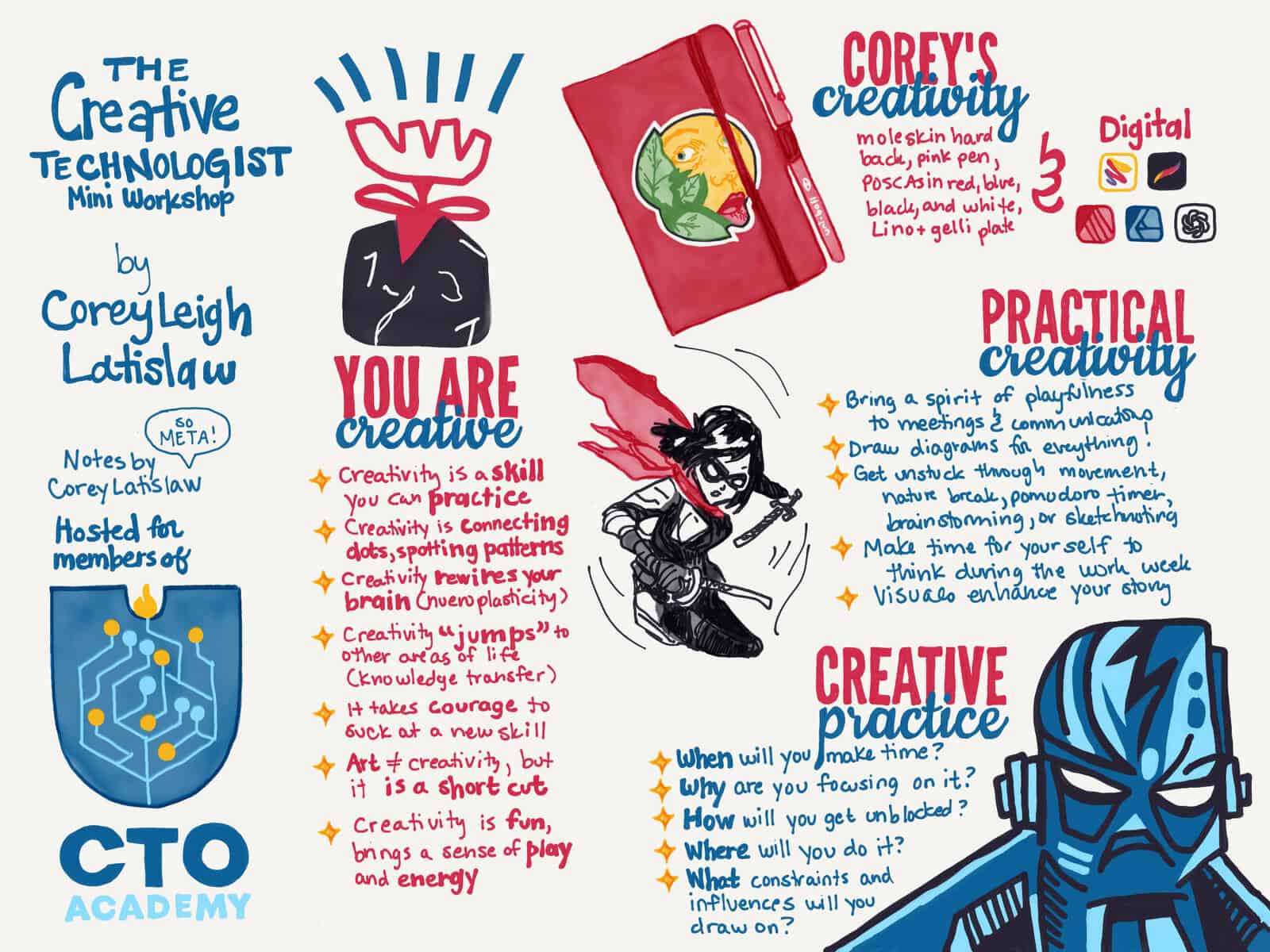 Here are some wonderful sketches by Corey Latislaw that accompany our live member sessions.